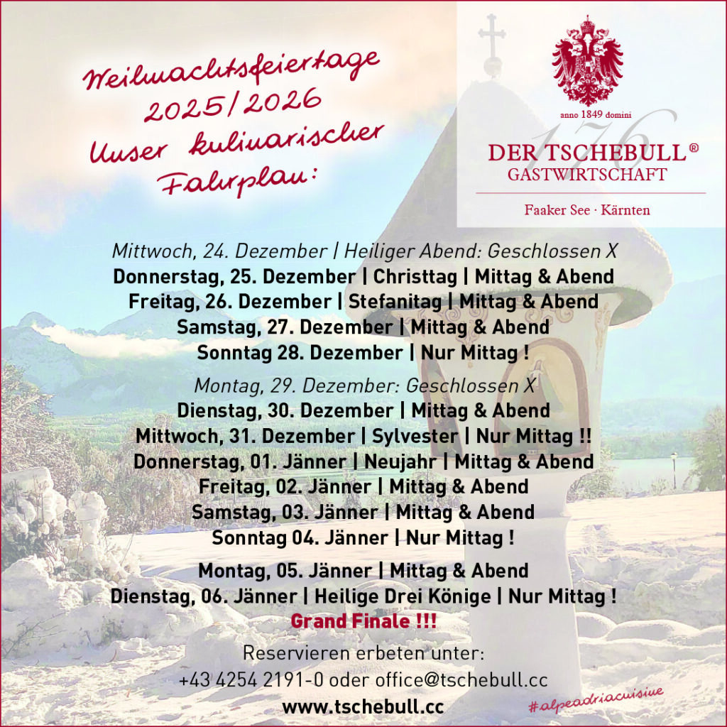 Wir freuen uns ab Donnerstag, den 4. Dezember auf klassische Bilderbuchgenüsse unserer #AlpeAdriaCuisine im Advent: TSCHEBULLS WEIHNACHTLICHE FESTTAGSKÜCHE. Wir starten gleich in die erste Woche mit zusätzlichen Öffnungszeiten, am Sonntag Abend und am Montag zu Mittag. Unbedingt rechtzeitig reservieren! P.S. Wir haben über die Weihnachtsfeiertage bis zum 6. Jänner 2026 (Heilige Drei Könige) geöffnet!…