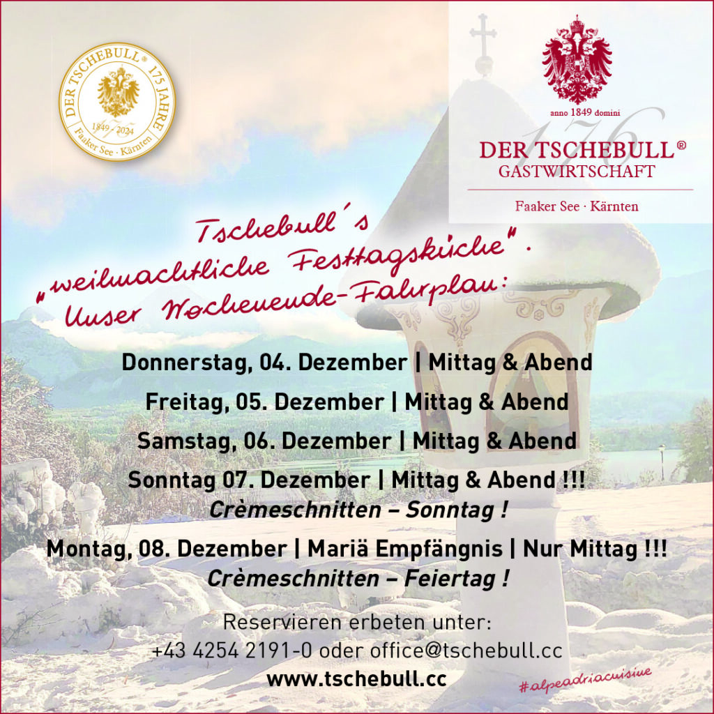 Der Tschebull ist eine der ältesten Gastwirtschaften Kärntens und ein Stück kulinarisches Selbstverständnis dieses Landes. Wir haben die Tradition der Väter im Herzen und trotzdem den Mut zu Veränderungen. Altes und Bewährtes pflegen wir, erfrischen es aber dennoch behutsam mit dem Esprit unserer heutigen Epoche. Aus Überzeugung gehen wir dabei keine falschen Kompromisse ein, erhalten…