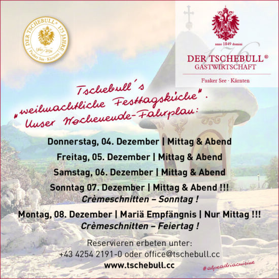 Geöffnet bis Dienstag, 6. Jänner 2026 (Heilige drei Könige). TSCHEBULL‘s ADVENT & WEIHNACHTLICHE FESTTAGSKÜCHE. Mit den großen Tschebull Allzeit-Klassikern und ausgewählten weihnachtlichen Gerichten aus der Alpe-Adria-Region. Es ist eben die herausragende Küche, die den Tschebull zu einem festen gastronomischen Begriff werden ließ. Wir freuen uns auf Sie! Hannes Tschemernjak | Wirt …