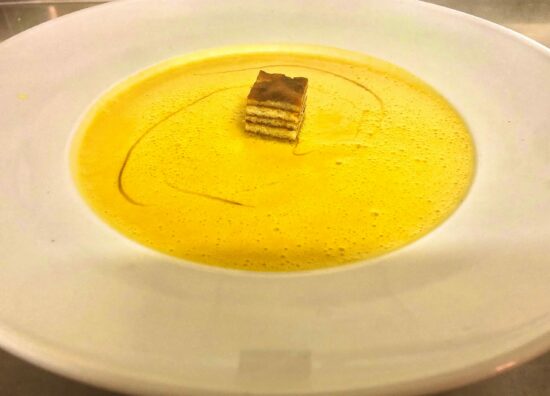 Tschebull’s Kürbiscrèmesupp’n | Baumkuchenwürferl Limonenblätteraromen & Safran-Essig-Reduktion … vom gelbfleischigen Kürbis, besonders rahmig. Crema di zucca | dadi di biscotto a forma tronco d’albero | aceto di zafferano Pumpkin cream soup | pyramid cake cubes | saffron-vinegar .