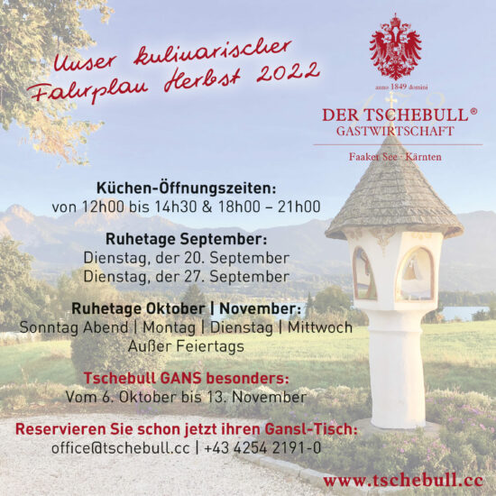 Nach unserem ersten Ruhetag am Dienstag, den 20. September, freuen wir uns schon – ab Mittwoch – Sie mit herbstlichen Schmankerln aus unserer neuen Tschebull Wochen-Karte verwöhnen zu dürfen…. .