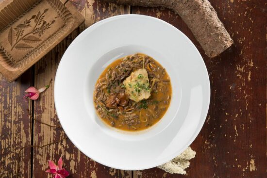 Unser feines Riesling-Kalbsrahmbeuscherl mit gebuttertem Palffy-Briocheknöderl Als Vorspeis‘ & als Hauptspeis‘ Ragout di cuore e polmone di vitello | canederli di pane della casa Ragout of veal hearts and lights | home-made bread dumpling …
